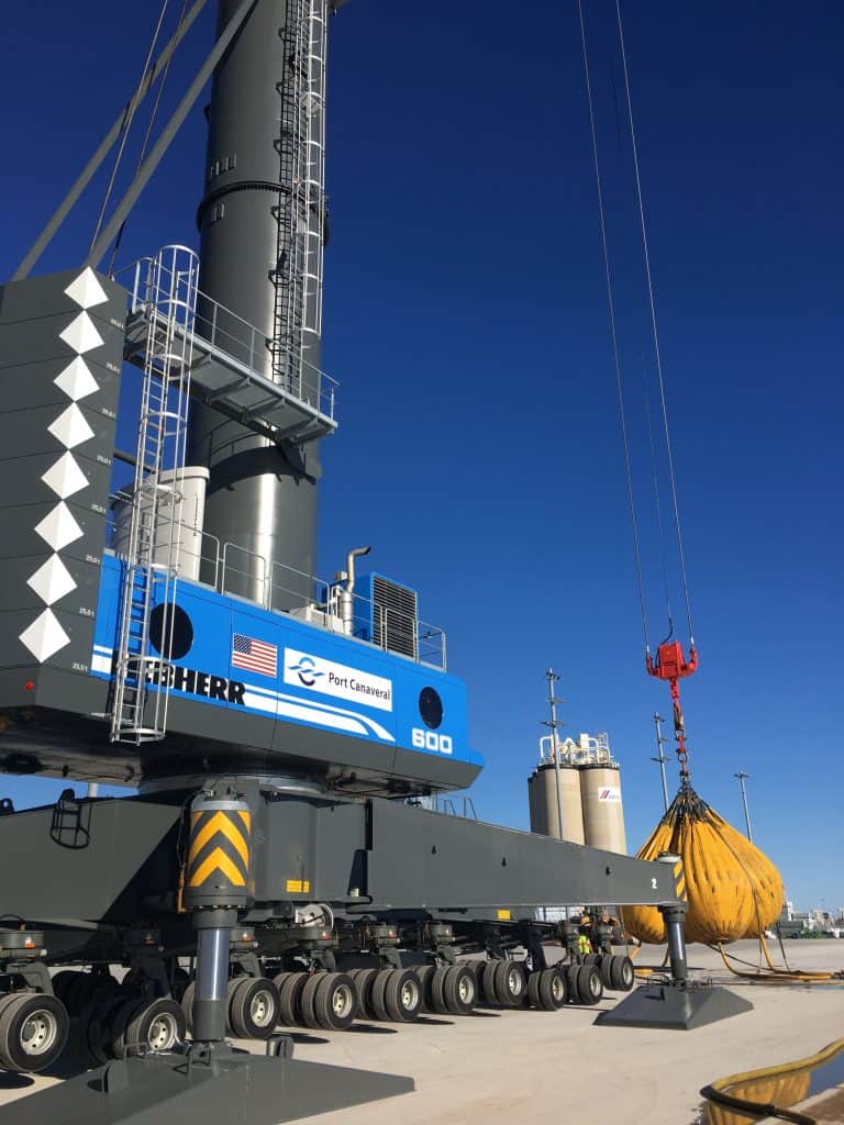 A custom-designed Liebherr LHM 600 mobile harbour crane (MHC) is in operation at Port Canaveral, enabling the efficient handling of all kinds of heavy cargo including space components as well as containers.